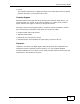 Chapter 6 Configuration Basics 4 SNAT is also now performed by default and included in the NAT table. 6.5 Feature Configuration Overview This section provides information about configuring the main features in the ZyWALL. The features are listed in the same sequence as the menu item(s) in the Web Configurator. Each feature description is organized as shown below. 6.5.1 Feature This provides a brief description. See the appropriate chapter(s) in this User’s Guide for more information about any feature.