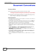 Document Conventions Document Conventions Warnings and Notes These are how warnings and notes are shown in this User’s Guide. Warnings tell you about things that could harm you or your device. Note: Notes tell you other important information (for example, other things you may need to configure or helpful tips) or recommendations. Syntax Conventions • The ZyWALL may be referred to as the “ZyWALL”, the “device”, the “system” or the “product” in this User’s Guide.