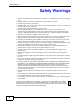 Safety Warnings Safety Warnings • Do NOT use this product near water, for example, in a wet basement or near a swimming pool. • Do NOT expose your device to dampness, dust or corrosive liquids. • Do NOT store things on the device. • Do NOT install, use, or service this device during a thunderstorm. There is a remote risk of electric shock from lightning. • Connect ONLY suitable accessories to the device. • Do NOT open the device or unit.