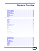 Contents Overview Contents Overview User’s Guide ........................................................................................................................... 27 Introducing the ZyWALL ............................................................................................................ 29 Features and Applications ......................................................................................................... 37 Web Configurator ................................................