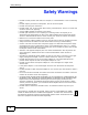 Safety Warnings Safety Warnings • Do NOT use this product near water, for example, in a wet basement or near a swimming pool. • Do NOT expose your device to dampness, dust or corrosive liquids. • Do NOT store things on the device. • Do NOT install, use, or service this device during a thunderstorm. There is a remote risk of electric shock from lightning. • Connect ONLY suitable accessories to the device. • Do NOT open the device or unit.