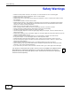 Safety Warnings Safety Warnings • • • • • • • • • • • • • • • • • • • Do NOT use this product near water, for example, in a wet basement or near a swimming pool. Do NOT expose your device to dampness, dust or corrosive liquids. Do NOT store things on the device. Do NOT install, use, or service this device during a thunderstorm. There is a remote risk of electric shock from lightning. Connect ONLY suitable accessories to the device. Do NOT open the device or unit.