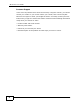 Chapter 19 Product Specifications Table 56 Firmware Specifications (continued) DHCP Server IP Pool 192.168.1.33 to 192.168.1.254 Static DHCP Addresses 10 Static Routes 16 Device Management Use the web configurator to easily configure the rich range of features on the ZyXEL Device. Wireless Functionality Allow the IEEE 802.11b and/or IEEE 802.11g wireless clients to connect to the ZyXEL Device wirelessly.