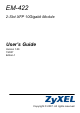 EM-422 User’s Guide Overview The EM-422 is an uplink module with two slots for XFP (10Gigabit Small Form Factor Pluggable) transceivers. It is designed for use with high-speed switches, such as the XGS4528F. After installing the EM-422 in a switch, the switch can have 10 Gigabit connections to a backbone switch or other network devices. This guide helps you set up and use your EM-422.