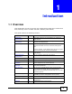 Chapter 1 Introduction SECTION PAGE DESCRIPTION Wall Mounting Instructions 47 How to attach the ZyXEL Device to a wall. Safety Warnings 49 Using the ZyXEL Device safely. Open Software Announcements 49 Description of ZyXEL’s open software use and where to download open source components modified by ZyXEL. Legal Information 51 Certifications, warranty and customer support information. 1.