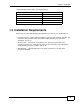 Chapter 1 Introduction Important information about your ZyXEL Device: Default Management IP Address 192.168.1.1 Default Subnet Mask 255.255.255.0 Default Admin User Name admin Default Admin Password 1234 Default User Name user Default User Password user 1.3 Installation Requirements Make sure you have the following things before you set up your ZyXEL Device: • Internet Account - Information provided by your ISP (the company that lets you connect to the Internet).