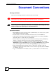 Document Conventions Document Conventions Warnings and Notes These are how warnings and notes are shown in this User’s Guide. 1 " Warnings tell you about things that could harm you or your device. Notes tell you other important information (for example, other things you may need to configure or helpful tips) or recommendations. Syntax Conventions • The P-660HN-F1 may be referred to as the “ZyXEL Device”, the “device”, the “system” or the “product” in this User’s Guide.